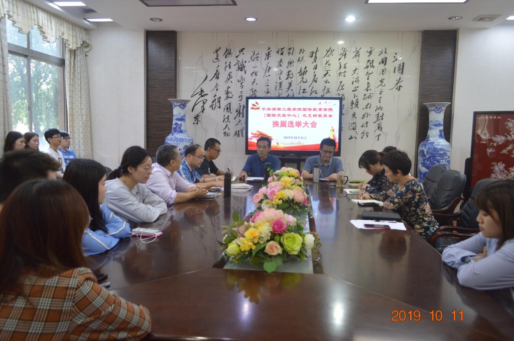 (国际交流中心)党总支在院会议室 E105召开换届选举大会,全体教工党员、学生党员参加。学院党总支书记苏哲民主持会议。