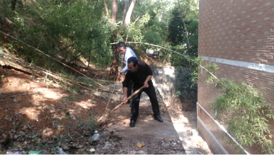 中午12点30分,党员同志们准时到达集合地点,在院党总支书记苏哲民的带领下,全体党员同志对明德五、六栋宿舍后山及周围的食品盒、塑料袋等垃圾进行清理打扫。大家捡拾了绿化带里的烟头、塑料袋、丢弃废旧衣物等,清理了宿舍周围的各种大型树枝和废弃杂物。党员同志们不惧脏和苦,全身心投入到劳动中。经过大家近两个小时的共同努力,明德五、六栋宿舍周围边环境变得整洁美观多了。