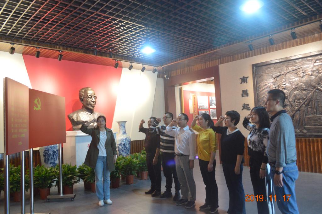 随后我院一行人,到达了李立三故居,全体党员在纪念馆前面对党旗庄严宣誓,重温入党誓词。在解说员的引导和认真讲解中,回顾了那段艰苦奋斗的岁月,重温了光荣不凡的革命事迹。通过参观纪念馆陈列的实物、图片,大家加深了对当年“救国图存”历史的认识,切实体会到老一辈无产阶级革命家对党的事业忠心耿耿、无私无畏的革命精神以及心系群众、一身正气的高尚品质。大家被李立三坚定的理想信念和伟大的革命情怀所打动,也被他实事求是、敢于自我批评的铮铮铁骨所折服。