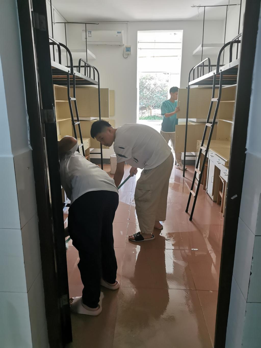 活动开始,全体成员在亲民3栋集合,分发完打扫工具后,成员们分为2~3人的小组,分工合作,进行打扫,整个清扫工作分工有序,工作人员认真负责。同学们认真擦拭桌椅、柜子、窗户等,并将物品摆放整齐,同时开窗通风,保持空气清新,打扫工作有条不紊。经过一个多小时的劳动,寝室灰尘、垃圾荡然无存,地面变得干净整洁,寝室面貌焕然一新。最后,同学们将宿舍空调、风扇、桌椅、门窗都进行了安全检查。