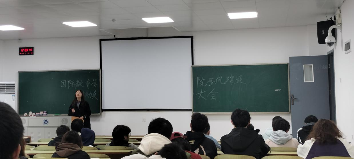 在教学楼C308召开学风建设动员大会,会议由学风专干唐欢主持。