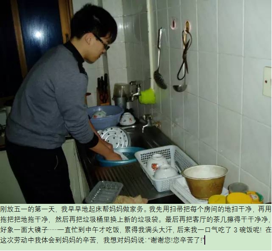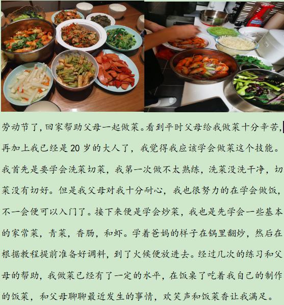 2021年5月1日,趁着五一劳动节,为了让同学们与父母在假期内更好的进行沟通交流,我院学生工作办公室和心理部组织了一次“点滴的爱”心理健康教育特色活动。活动采用手机摄影的方式,记录假期内与父母互动的点滴过程并用简短文字描述,如做饭、打扫卫生等。全院同学积极踊跃地参加了本次活动。透过作品我们可以感受到家庭的温馨、同学们与父母一起劳动的快乐,同学们也真切体会到父母艰辛。