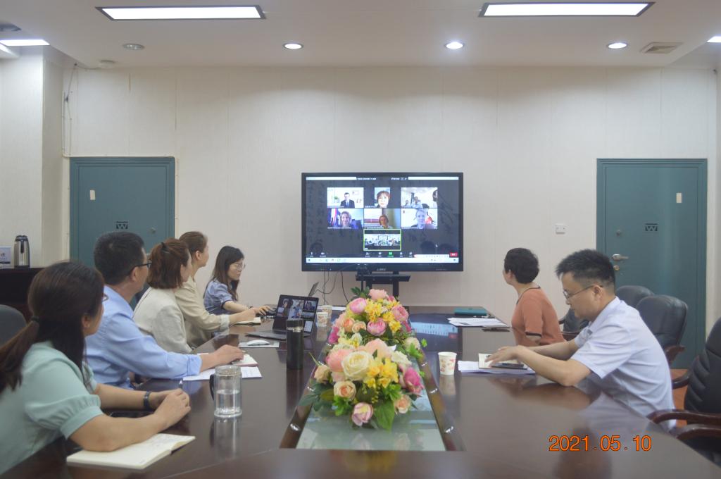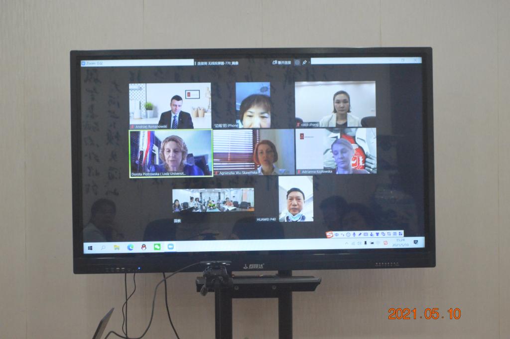 与波兰罗兹科技大学在主校区E-105召开线上洽谈会议,副校长罗毅平通过视频参加会议。