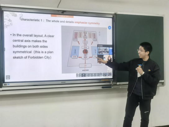 学生通过精心准备的PPT,与英方同学分享了中国现代建筑和中国传统建筑两种鲜明的建筑类型,从建筑的起源与发展、设计特点及代表建筑物等方面向英方同学介绍了中国建筑。同学们通过图片、视频和文字展示了中国建筑文化的源远流长与博大精深。同时,英方同学也通过生动的图片和语言向大家展示了英国欧式建筑并介绍了欧式建筑特点,引起中方同学极大的兴趣。