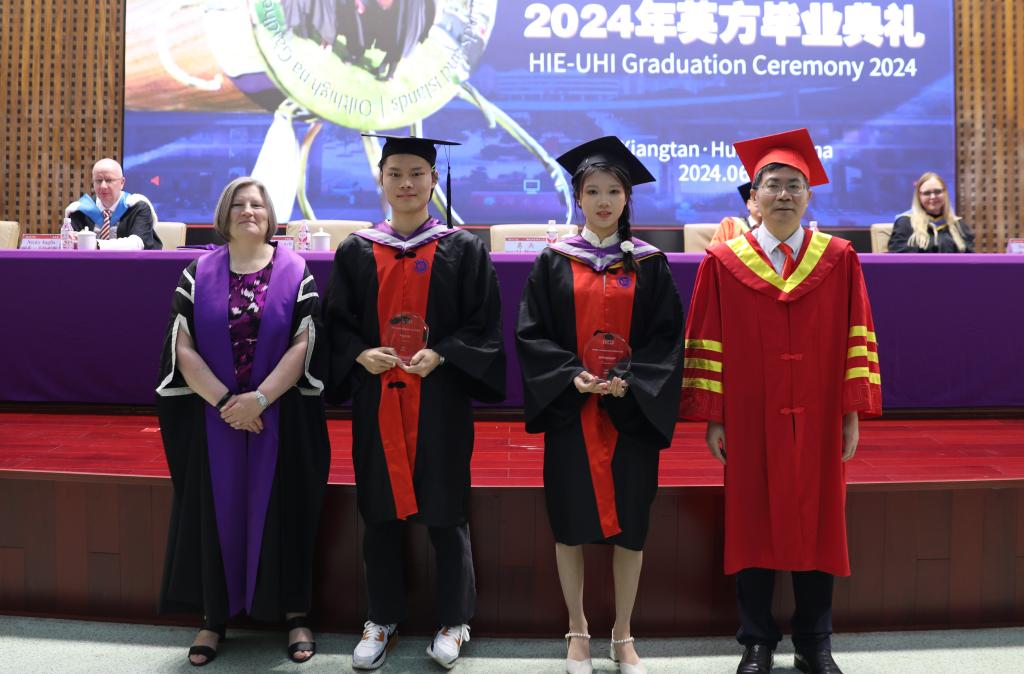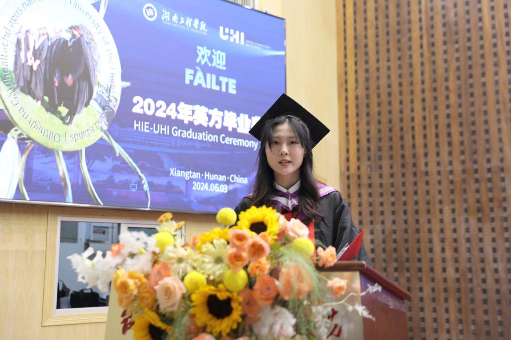 “大学四年,我们在这片多元文化交融的沃野上,探寻了知识的无垠,领略了文化的魅力。”“感谢两校为我们开辟了‘弯道超车’的新赛道。”优秀毕业生王曦宇与杨沁代表国教2020级全体毕业生致辞。他们向深爱的母校、敬爱的师长、亲爱的同学们以及共同走过的四年青春岁月,致以最深的敬意;向辛勤付出的家人们致以最衷心的感谢。他们表示将继续秉承“锲而不舍,敢为人先”的湖工精神,怀揣梦想与决心,从此启航,奔赴下一场星辰大海。
