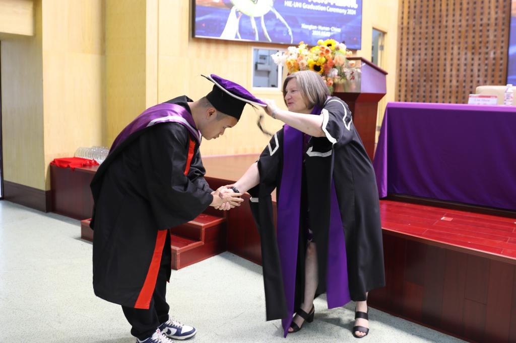 随后,UHI珀斯校区副校长Veronica Lynch博士依次向获得英方学士学位的同学,行苏格兰毕业庆典“Doff”礼。两校领导颁授UHI学位证书,并为其中获得UHI学士学位优秀等级的20位毕业生颁发奖杯。