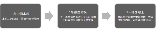 3+1+2,即前3年学生在中国就读本科,在大三通过在华合作高校提名并通过德国教授赴华面试团审于在大四前往德国巴特洪堡应用技术大学交换1学年,在交换期间通过学校单招语言内测可免雅思被德国巴特洪堡应用技术大学相关硕士专业录取(8个硕士专业任选1)。