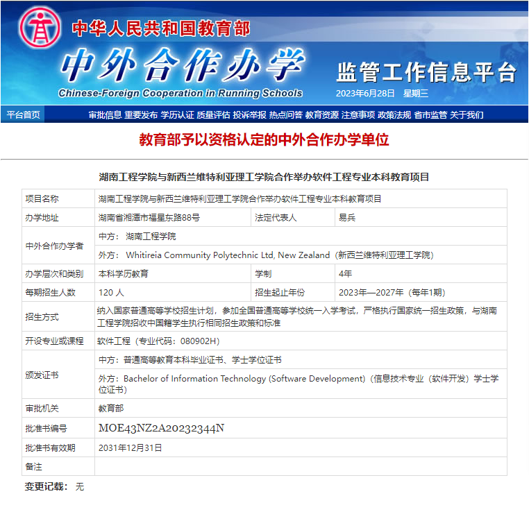 (以下简称HIE)与新西兰维特利亚理工学院(Whitireia Community Polytechnic Ltd, New Zealand,以下简称Whitireia)合作举办软件工程专业本科教育项目,是经湖南省教育厅审核、教育部审批的本科合作办学项目。自获得办学批准之日起,HIE和Whitireia严格按照国务院颁布的《中华人民共和国中外合作办学条例》及教育部发布的《中华人民共和国中外合作办学条例实施办法》和一系列文件精神规范办学。