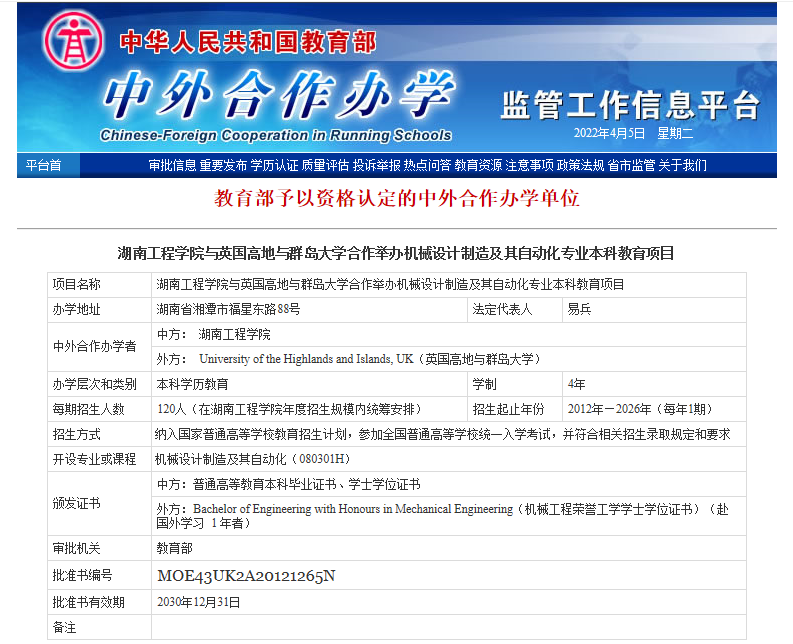 (以下简称HIE)与英国高地与群岛大学(University of the Highlands and Islands,以下简称UHI)合作举办机械设计制造及其自动化专业本科教育项目,是经湖南省教育厅审核、教育部审批的本科合作办学项目。自获得办学批准之日起,HIE和UHI严格按照国务院颁布的《中华人民共和国中外合作办学条例》及教育部发布的《中华人民共和国中外合作办学条例实施办法》和一系列文件精神规范办学。在合作办学项目实施过程中,规范合作办学项目管理,努力提高办学质量。