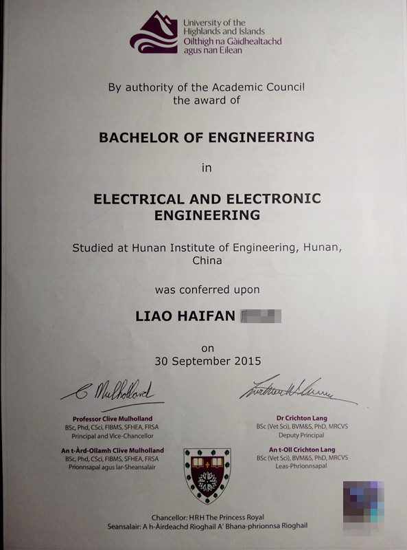 颁发的本科毕业文凭和工学学士学位。第四学期末,学生英语成绩达到要求的,可注册为UHI海外学生,第三年学生不出国在修完UHI专业课程后,成绩合格可获得UHI的电气及电子工程普通学士学位(BEng in Electrical and Electronic Engineering)。