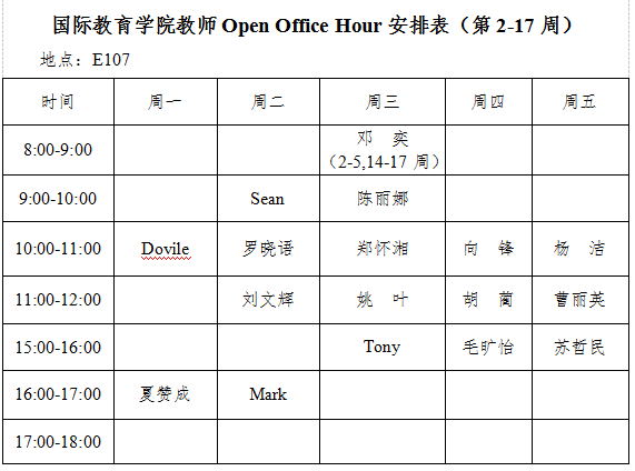 为加强师生交流,帮助学生在学业、生活和人生规划等方面更好地发展,形成有温度的、全员全方位全过程育人的文化氛围,学院决定从2018年9月10日开始实施“面对面开放交流”(Open Office hour)制度。现将本学期教师“面对面开放交流”(Open Office Hour)时间公布如下,欢迎同学们与老师进行面对面沟通交流。