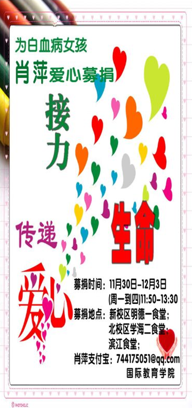 的新校区明德一食堂;北校区学海二食堂和滨江食堂分别进行摆点募捐活动,由青年志愿者协会、心理部和公关策划部三大部门负责摆点募捐,在本次募捐活动中志愿者们都无谓严寒,每天都准时准点在募捐地点进行摆点……在4天风雨无阻的募捐活动中,数百人积极响应,4天的募捐共筹集善款4600元。对于如此庞大的医疗费用,我们的捐款是多么的渺小,但我们都知道,积少成多,越多人献出自己的爱心,肖萍学姐得到的帮助也就越多。