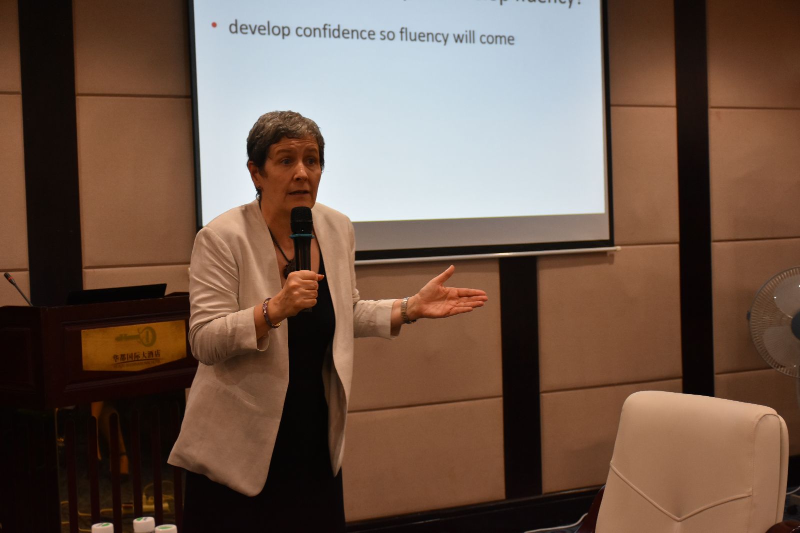 副院长曹丽英主持,以分组学习和讨论的形式展开。在上午的会议中Neilane Liew 介绍了国际英语测评体系在中国英语教学中的运用,从写作主题的切合度、词汇运用的广度、语法的正确性等方面对雅思写作的评分标准进行了详细分析,以案例分析的形式让参会的老师们进行研讨和分组汇报。在下午的会议中Neilane Liew分析了雅思口语的评分标准,阐释了中国学生雅思口语环节薄弱的个人和社会原因,探讨了口语教学改革理念和举措。