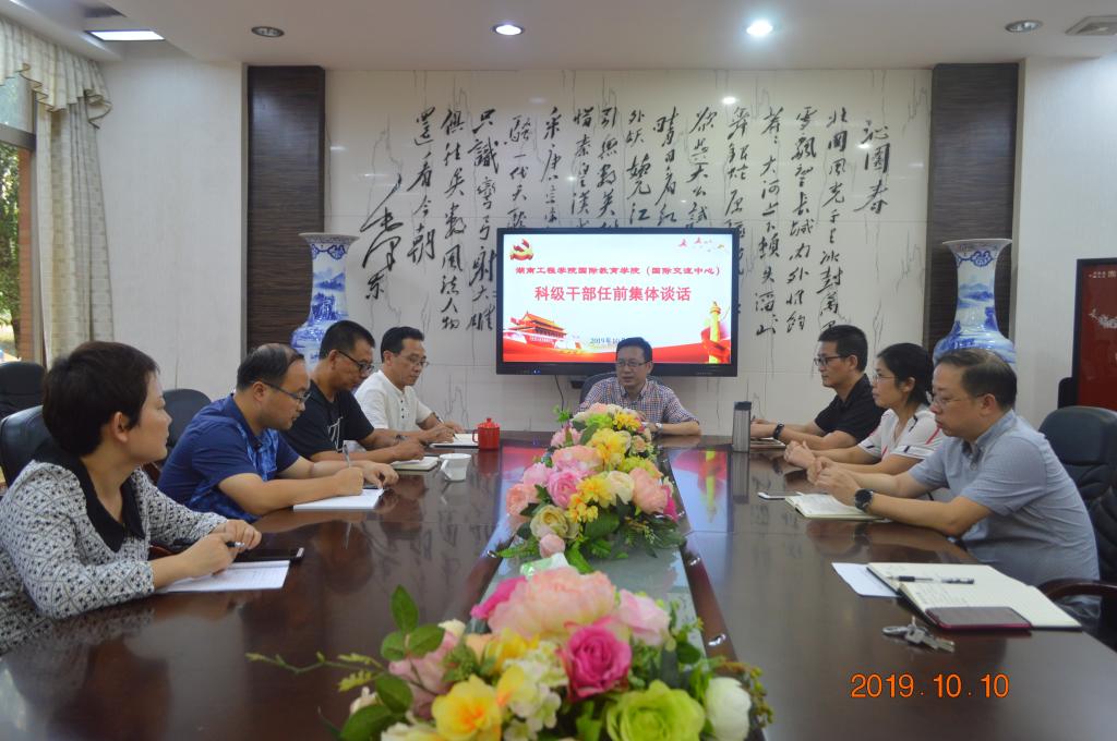 (国际交流中心)召开新聘任的科级干部任前集体谈话。党总支书记苏哲民主持会议,全体院领导和科级干部参会。学校党委委员罗毅平副校长出席会议并重要讲话。