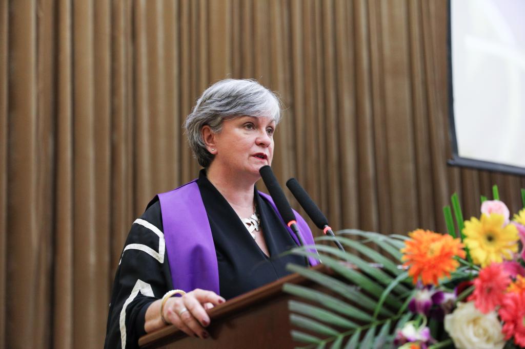 UHI Perth校区校长Margaret Cook博士依次向获得英方学士学位的同学行苏格兰毕业庆典“Doff”礼,并为优秀毕业生颁发奖杯。优秀毕业生中特别突出的唐茜同学因在机械与能源工程荣誉学士学位中获得最高分数而被授予2019年英国工程技术学会(IET)奖。UHI珀斯校区副校长Veronica Lynch博士为毕业生颁发学位证书。在校毕业生简明睿和刘惠萃作为学生代表发言,从求知若渴的大一新生到如今小有本领的毕业生,她们对学校提供的良好学习环境,以及家人给予的关爱支持表示衷心的感谢,并祝愿所有毕业生前程似锦,未来可期。