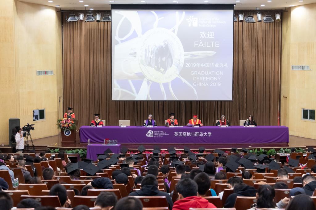 与英国高地与群岛大学(UHI)合作举办的本科教育项目2019年英方毕业庆典在一报告厅举行。