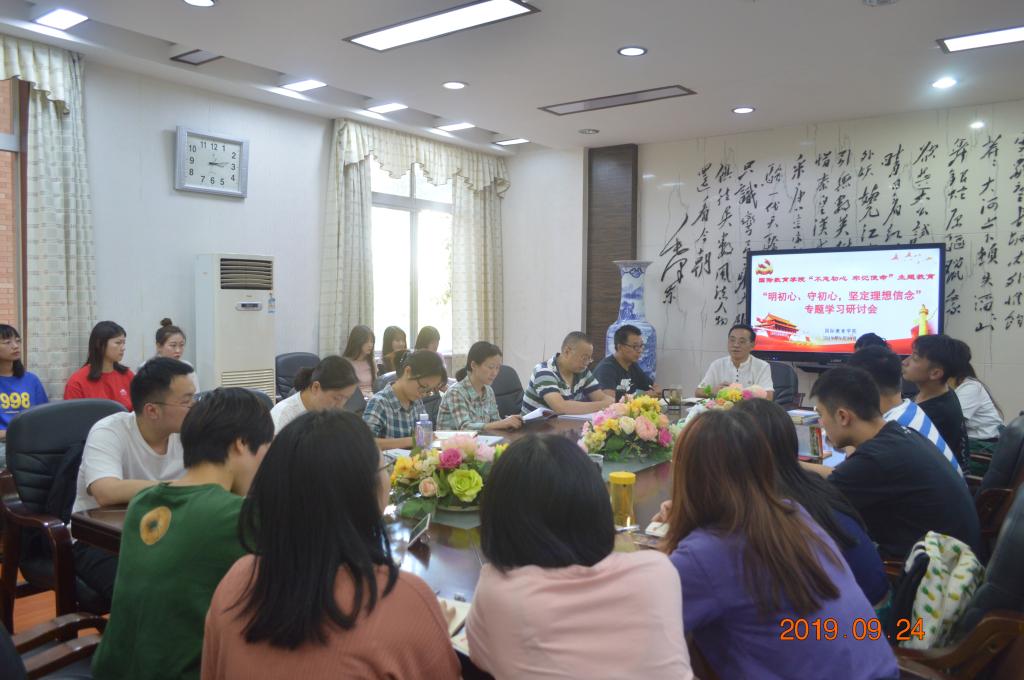 在E105会议室召开“不忘初心、牢记使命”主题教育第一专题“明初心、守初心、坚定理想信念”学习研讨会。学校“不忘初心、牢记使命”主题教育督导七组联络员涂璐莅临指导,全体教工党员和学生党员参加会议。会议由党总支书记苏哲民主持。