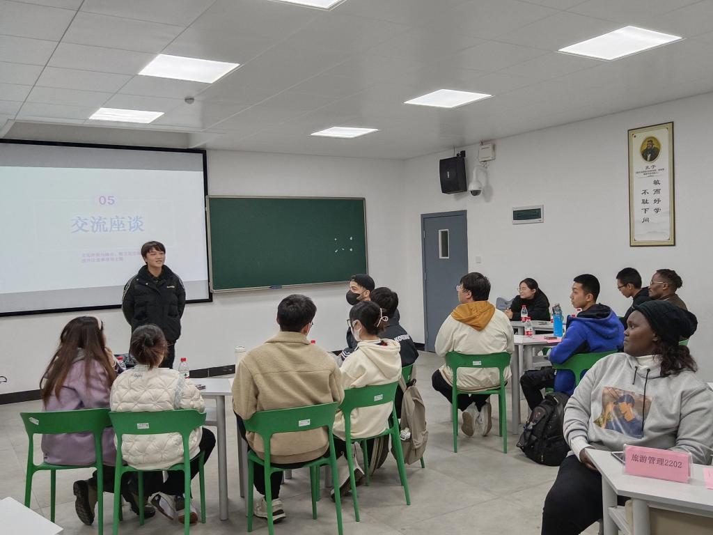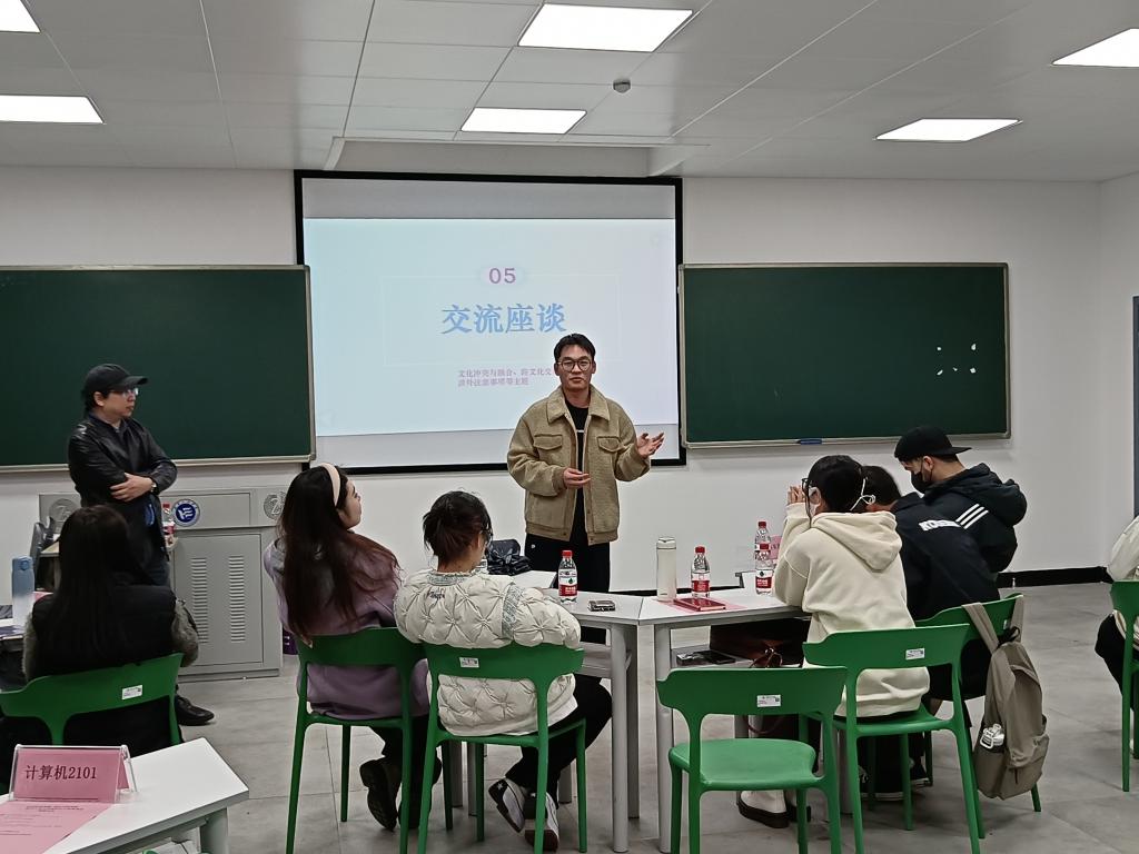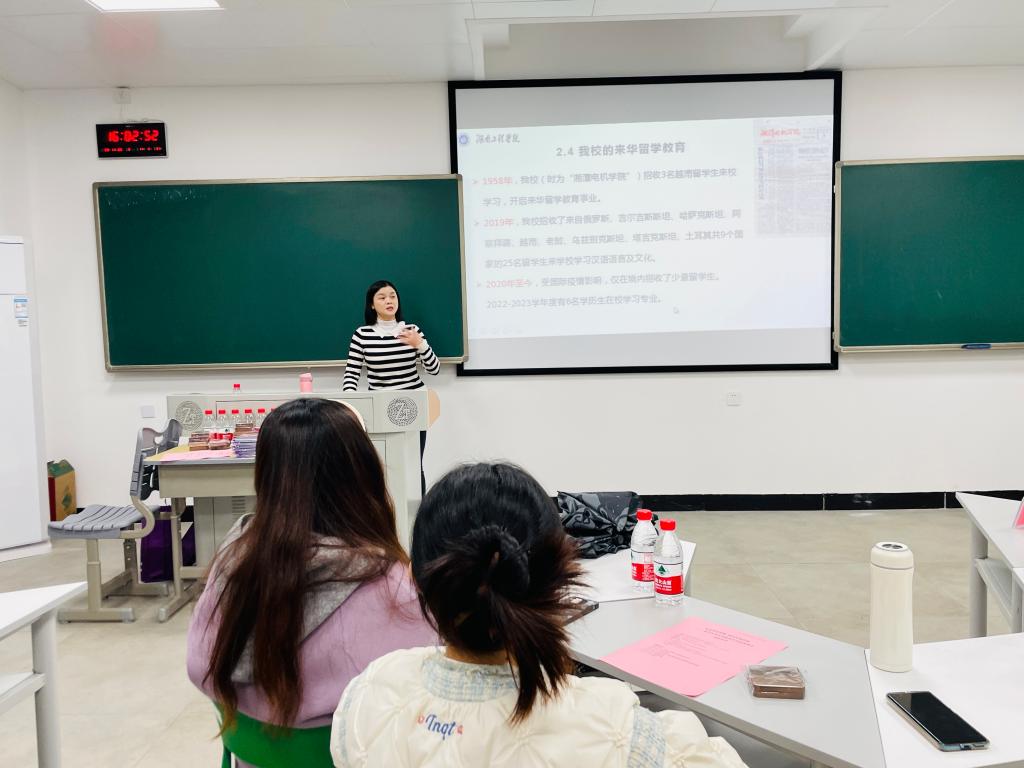 “国家为什么如此重视来华留学生的培养?”“我们学校是怎样培养留学生的?”“我们在座师生可以怎样从中发挥作用呢?”留学生辅导员黄宇从来华留学生最关注的几个问题出发,与在座的中外师生展开探讨,介绍了学校留学生相关政策和培养情况,激励同学们讲好中国故事,传播好中国声音。