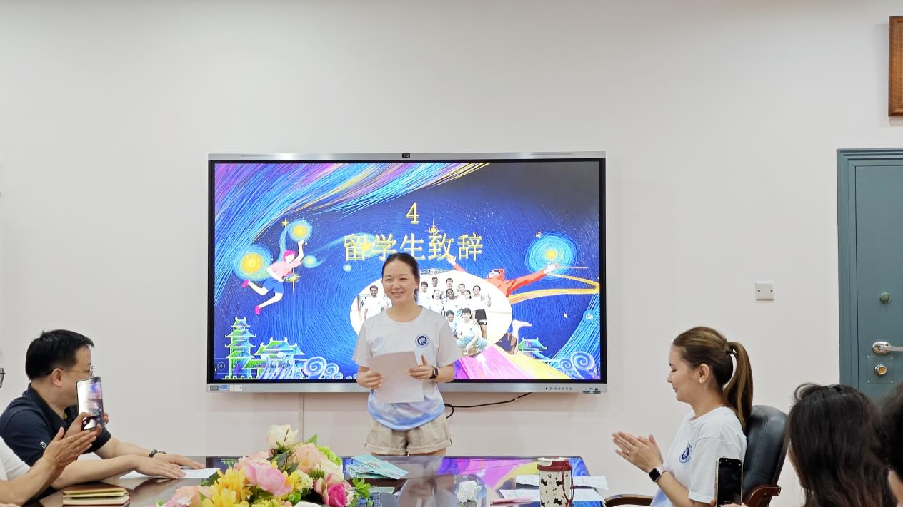 一段精心制作的纪念视频拉开了序幕。镜头里,留学生们初抵湘潭时的青涩模样与如今的自信风采交叠呈现,从合唱比赛的舞台初体验到排球赛场上的默契配合,从国画课堂的墨香氤氲到湖南博物院的实地研学,每一个珍贵瞬间都印证着同学们跨越语言障碍、探索中国文化的成长轨迹。