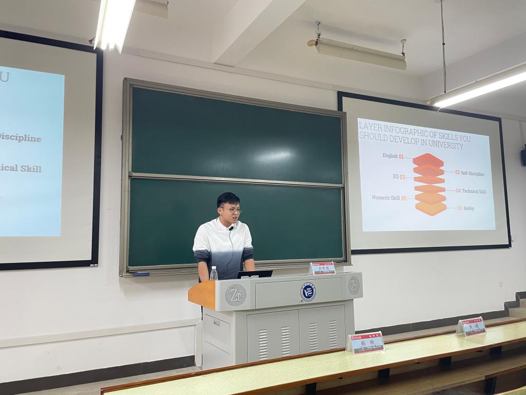 首先,彭禹向参会同学介绍了三位优秀校友,并对校友们返回母校表示热烈欢迎。第一位开讲的是2016级电气工程及其自动化专业毕业、目前正在澳大利亚新南威尔士大学攻读硕士学位的胡哲铭校友,他围绕六个关键词与学弟学妹们分享了自己的学习经验,介绍了许多实用又有效的学习方法,特别指出如何使用一些学习软件辅助自己的学习,如何加强自律以及合理处理人际关系等。他的讲座有助于新生做好大学四年的学业规划,极大地增长了他们的学习信心。
