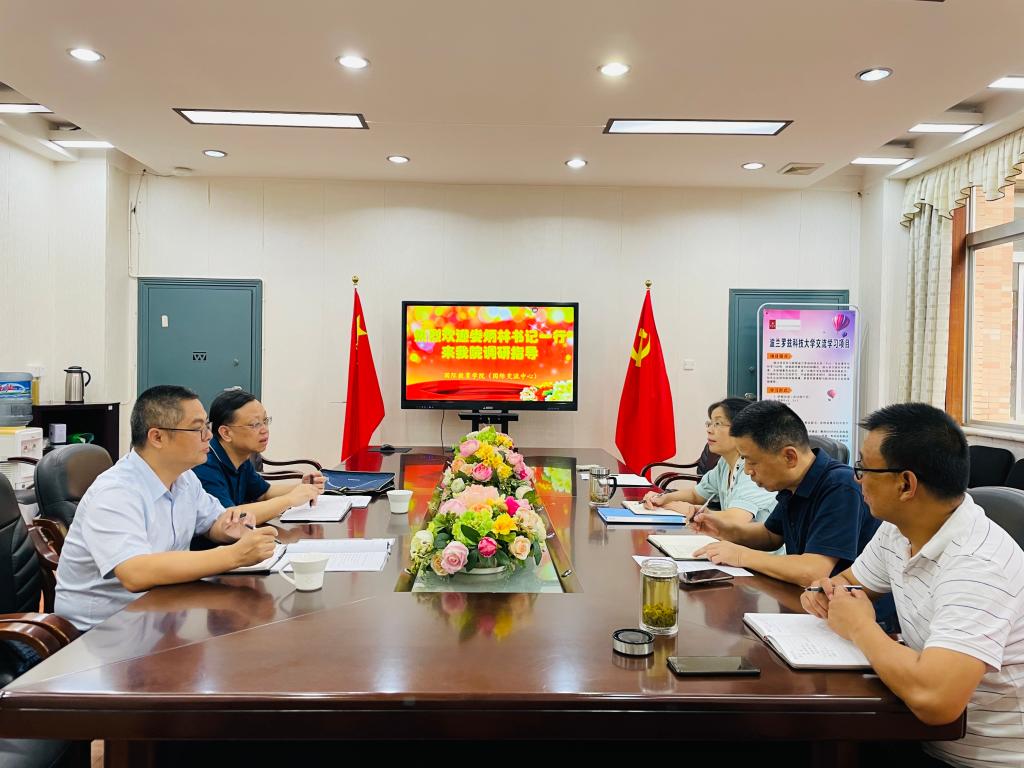 (国际交流中心)检查指导校友工作,院长曹丽英、党总支书记罗胜杰、副书记连泰和负责校友信息收集工作的老师参加会议。
